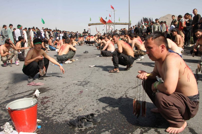KABUL, AFGHANISTAN: Afghan Shiite Muslims flagellate themselves with chains during a mourning procession commemorating Ashura, in Kabul, Afghanistan on September 20, 2018. Muslims across the world are observing Muharram. The climax of Muharram is the Ashura ceremony commemorating the martyrdom of Imam Hussein, a grandson of the Prophet Mohammed in the Iraqi city of Karbala in the seventh century. Haroon Sabawoon/ Afghan Multimedia Agency (AMA)