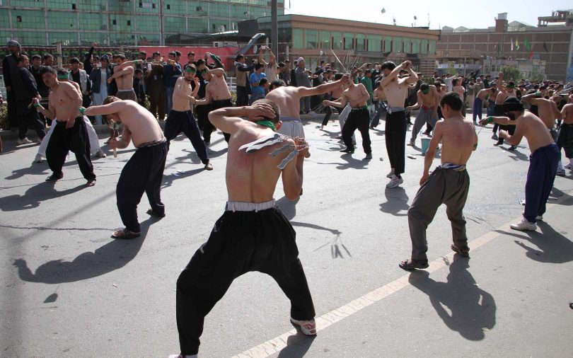 KABUL, AFGHANISTAN: Afghan Shiite Muslims flagellate themselves with chains during a mourning procession commemorating Ashura, in Kabul, Afghanistan on September 20, 2018. Muslims across the world are observing Muharram. The climax of Muharram is the Ashura ceremony commemorating the martyrdom of Imam Hussein, a grandson of the Prophet Mohammed in the Iraqi city of Karbala in the seventh century. Haroon Sabawoon/ Afghan Multimedia Agency (AMA)