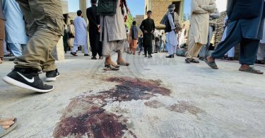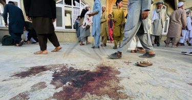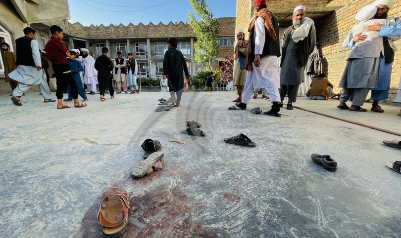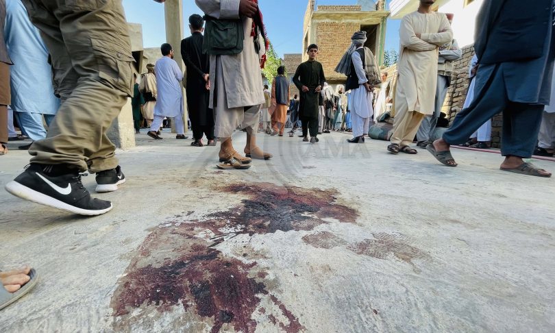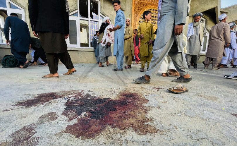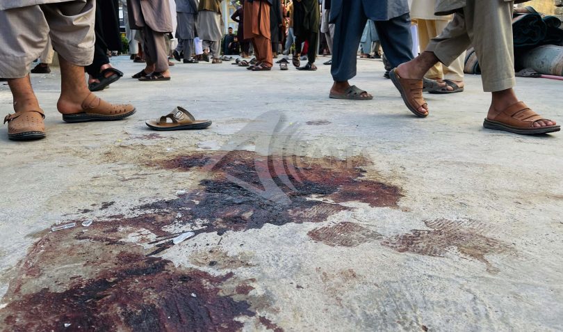 KABUL, AFGHANISTAN-MAY 14: Blood covers the ground after a blast targets Friday prayer in Shakar Dara north district of Kabul, Afghanistan, on May 14, 2021. At least 12 people including Imam Mufti Numan were killed and injured dozens more in Kabul mosque. Afghanistan marks the second day of Eid al-Fitr. The Taliban has condemned the attack in a twitter post, and call it a terrorism act. Afghan Officials confirmed the attack. HAROON SABAWOON/AFGHAN MULTIMEDIA AGENCY/AMA
