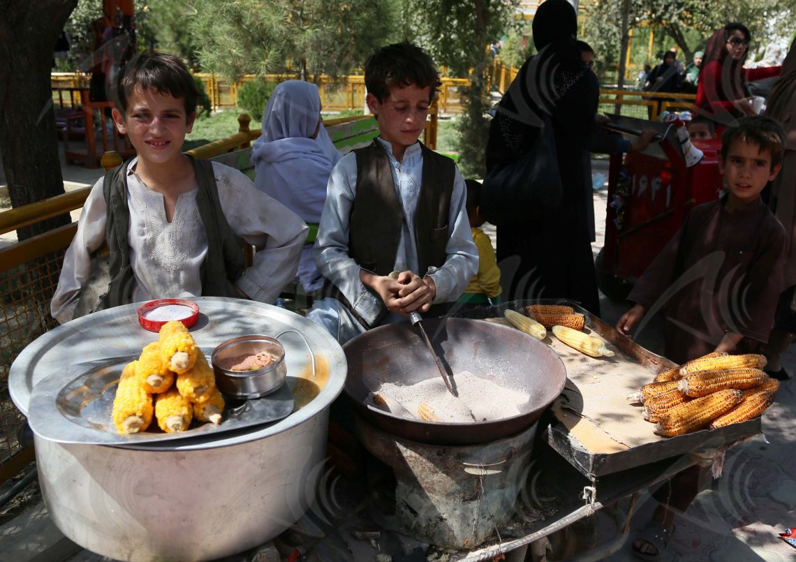 Kabul, Afghanistan – March 21: Afghan children sell corn during the first day of Eid al-Fitr in Kabul, Afghanistan, on March 21, 2013. This year Eid al-Fitr has gone silently due to pandemic Corona-Virus. Eid al-Fitr is one of the two major holidays in Islam, which is celebrating to mark the end of the Holy month of Ramadan. Archive/ Afghan Multimedia Agency “AMA”