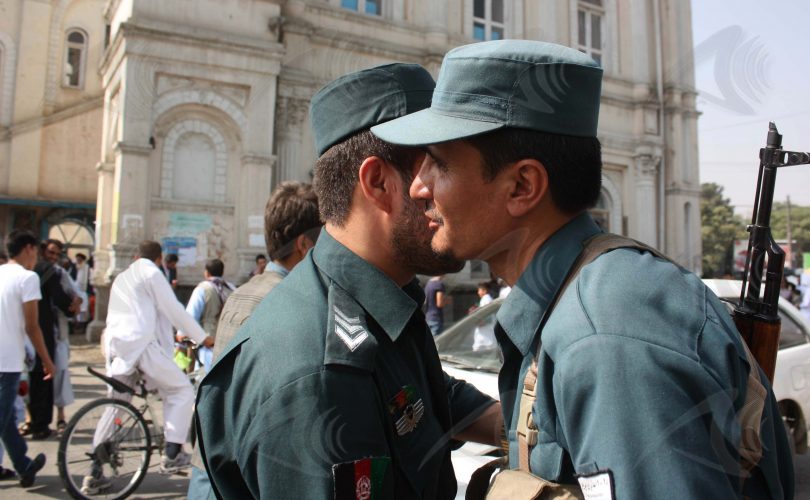 Kabul, Afghanistan – March 21: Afghan policemen embrace each other after Eid prayers as they celebrate Eid al-Fitr in Kabul, Afghanistan, on March 21, 2013. This year Eid al-Fitr has gone silently due to pandemic Corona-Virus. Eid al-Fitr is one of the two major holidays in Islam, which is celebrating to mark the end of the Holy month of Ramadan. Archive/ Afghan Multimedia Agency “AMA”