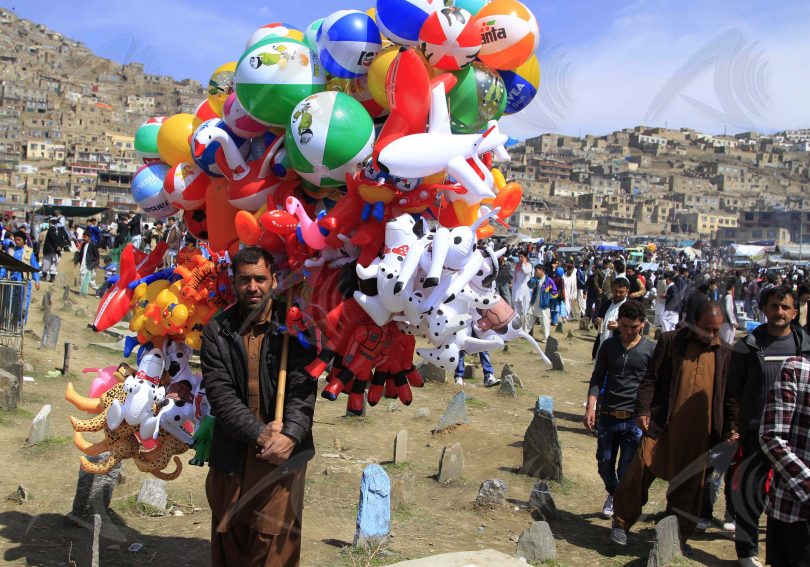 KABUL, AFGHANISTAN-MARCH 21: Afghan man Sales balloons as Afghan peoples gather around the Shrine of Saint Sakhi Saib as they celebrate the Persian New Year Nowruz in Kabul, Afghanistan, 21, March 2017. Haroon Sabawoon/ Anadolu Agency