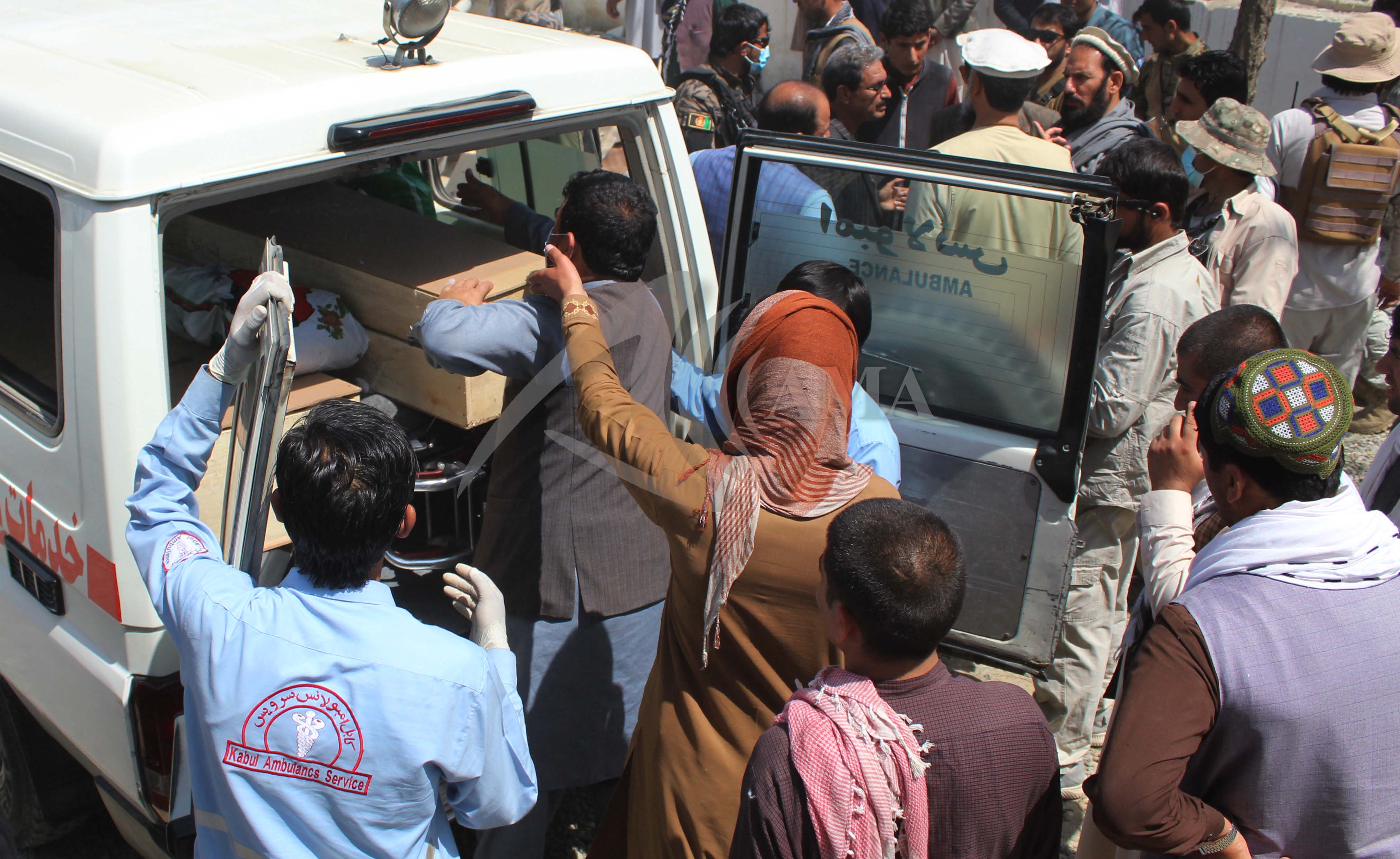 AFTERMATH-LOGAR, AFGHANISTAN-MAY 01: Kabul ambulances move dead bodies to the hospital after a truck bomb hits Pol-e-Alam city of Logar, Afghanistan, on May 01, 2021. At least 27 people were killed and injured dozens more after a truck packed with explosives detonated near the house of the former head of provincial council, Didar Lawang on Friday evening, meanwhile the U.S troops leave Afghanistan by September. Local officials said. HAMID SABAWOON/AFGHAN MULTIMEDIA AGENCY/AMA