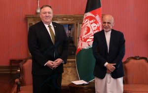 KABUL, AFGHANISTAN – MARCH 23: Handout photos by the Afghan Presidential Palace shows Afghan President Mohammad Ashraf Ghani receiving US Secretary of State Mike Pompeo at the presidential palace in Kabul, Afghanistan on March 23, 2020. AMA / PRESIDENTIAL PALACE HANDOUT